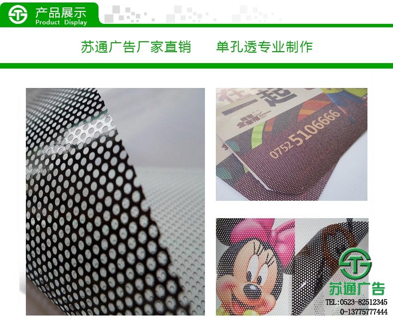 單孔透是用于戶外玻璃幕墻和車窗玻璃的一種理想的廣告材料,可以利用其噴繪出任何廣告或裝飾畫面;PVC膜經(jīng)過(guò)制孔后的透光結(jié)構(gòu)使得大約50%的光線透過(guò)畫面照射進(jìn)來(lái),在減少太陽(yáng)光照射的同時(shí),仍保證了高質(zhì)量的廣告畫面,畫面的視覺(jué)效果不受到任何影響,而且不影響室內(nèi)采光和視覺(jué),達(dá)到外面只能看到廣告畫面,而室內(nèi)往外看則仍是透明的效果。